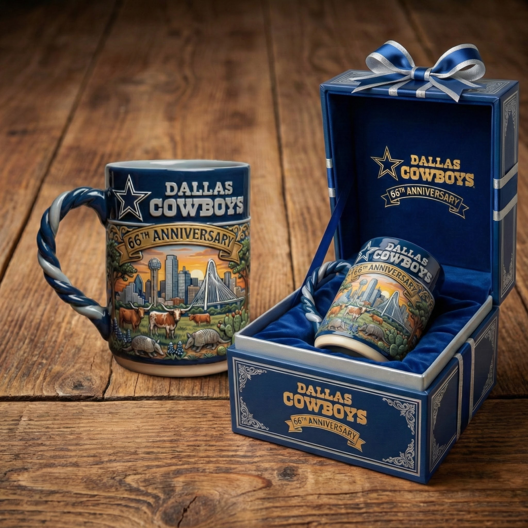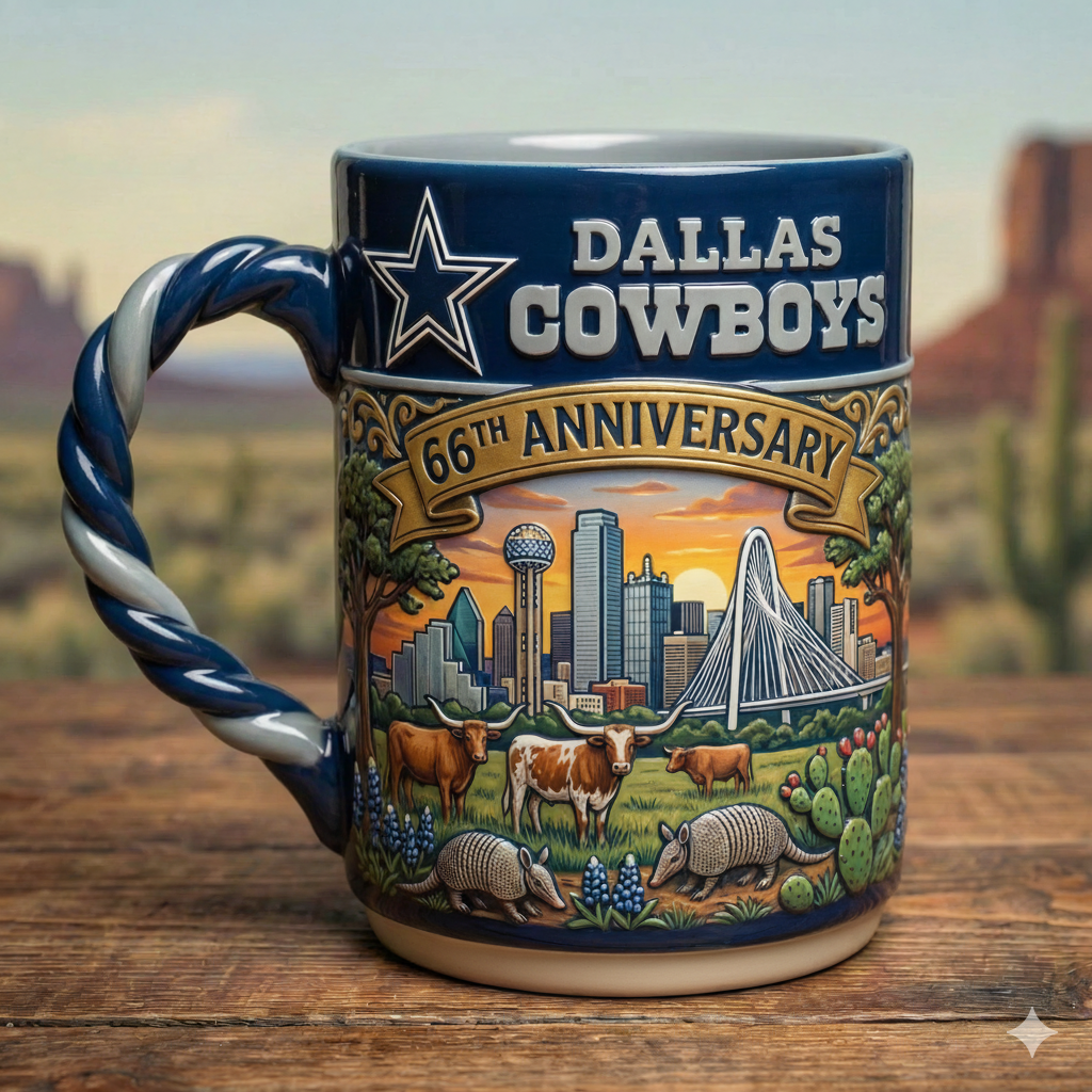 Celebrate the Dallas Cowboys' 66th Anniversary with this stunning commemorative mug. Featuring iconic imagery from Texas and the Cowboys' rich legacy, this mug is the perfect way to honor the team’s history and spirit. With intricate artwork of Dallas’ skyline, local wildlife, and the Cowboys’ star emblem, it’s an ideal addition to any fan’s collection.