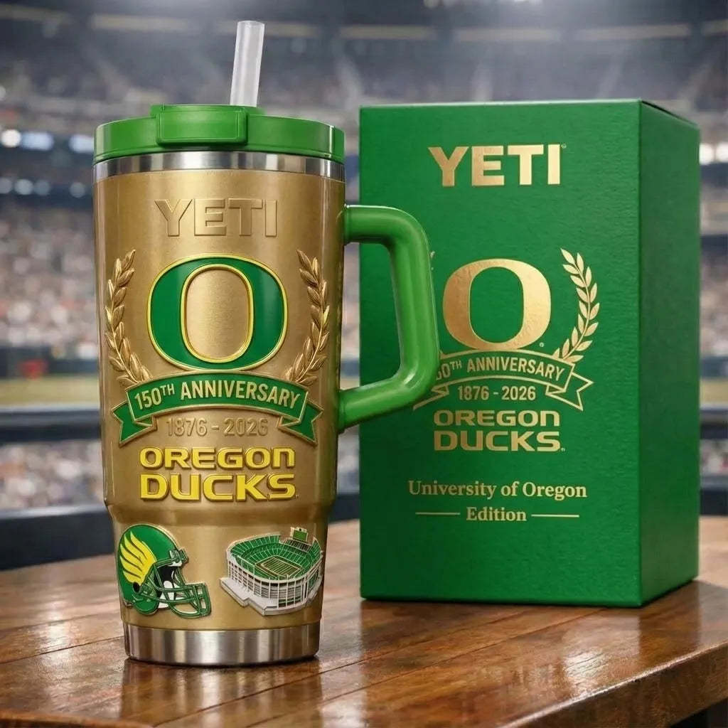 The ultimate tribute to the University of Oregon! 🎓🏆 Commemorating the 1876-2026 era with this stunning Limited Edition Gold Tumbler. Durable, luxurious, and distinctively Green & Yellow. Perfect for alumni and collectors. Grab yours before kickoff��stock is flying! 🛒🔥