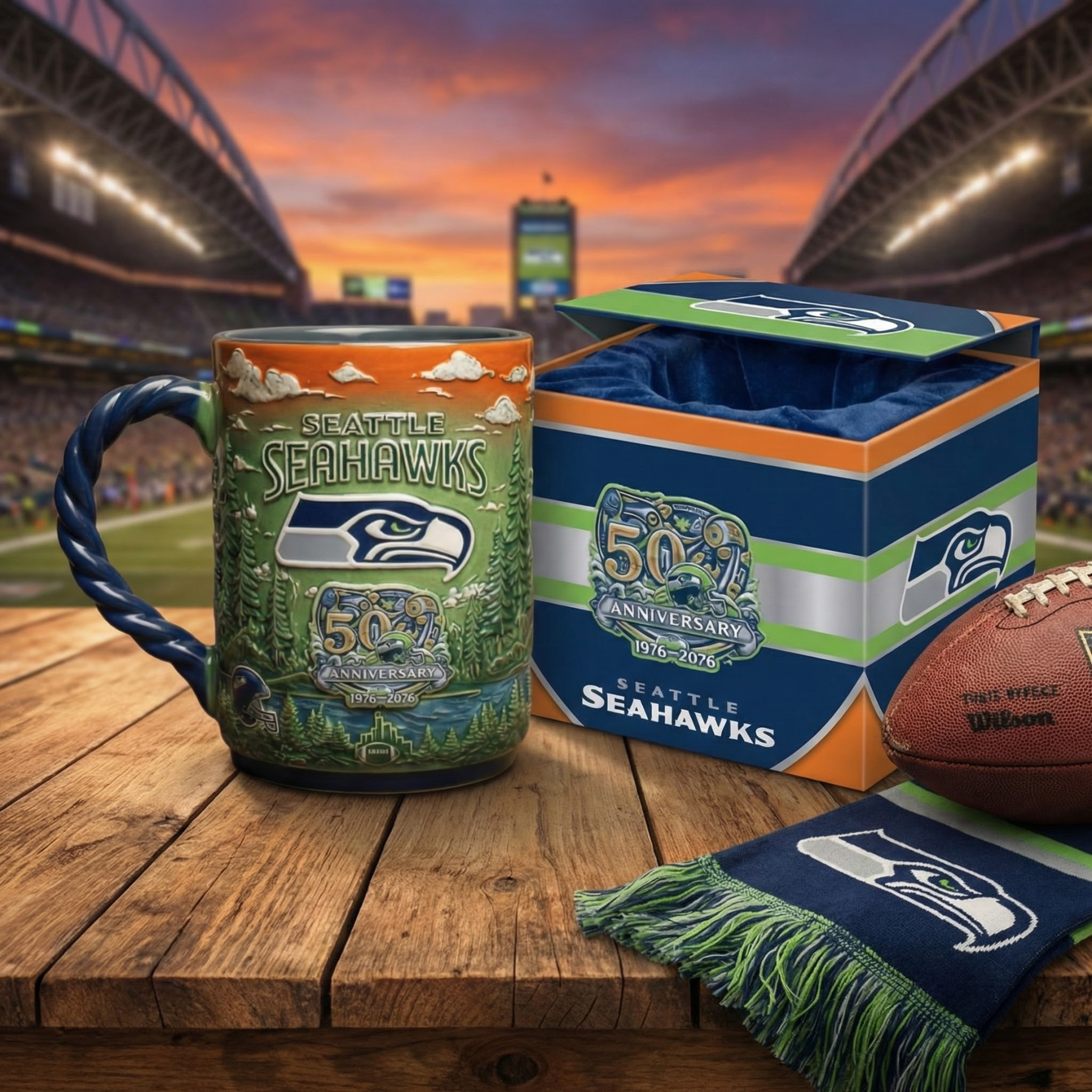 Celebrate 50 years of Seattle Seahawks pride with this 50th Anniversary Commemorative Mug! Featuring vibrant artwork of the iconic Seahawks logo, lush forests, and the stunning Pacific Northwest scenery, this mug is the perfect way to honor five decades of excellence. The limited-edition mug combines stunning design with high-quality craftsmanship, making it an essential collectible for every Seahawks fan.