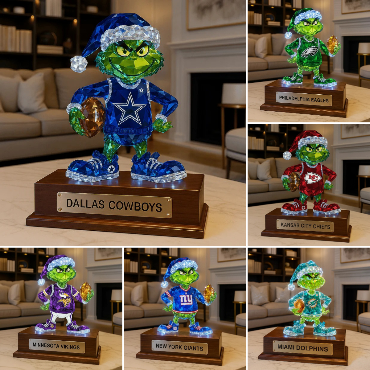 Team Spirit: Each figurine is designed with your favorite NFL team’s logo and colors, bringing the Grinch into the heart of your team’s world. Available for teams like the Kansas City Chiefs, Philadelphia Eagles, Dallas Cowboys, and more!
