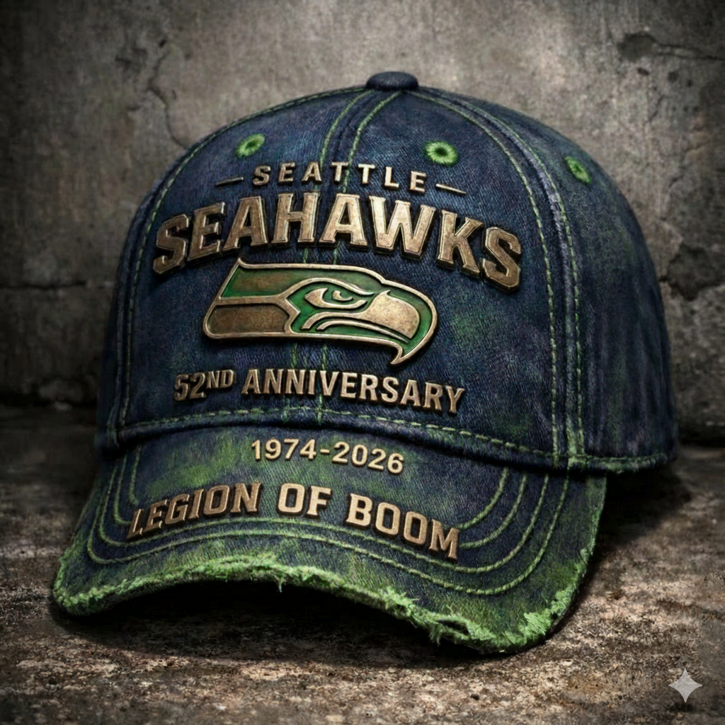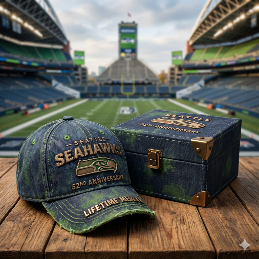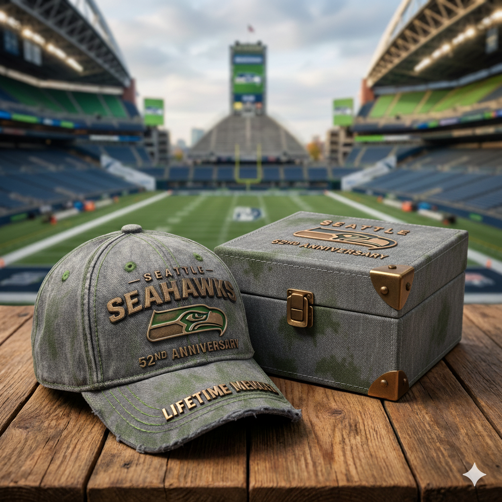 Celebrate 52 years of legendary Seahawks football with this exclusive cap and keepsake box set! Featuring the commemorative 52nd Anniversary cap with a distressed vintage design, this set also includes a beautifully crafted box to store your treasured item. The cap features the iconic Seahawks logo, "Legion of Boom" emblem, and anniversary details that pay tribute to the team’s unforgettable history. Whether you’re attending a game at Lumen Field or displaying it in your collection, this cap is a must-have for all true Seahawks fans.